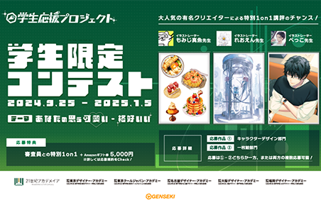 この度、GENSEKI学生応援プロジェクトの一環で 学校法人21世紀アカデメイアのデザイナー・アカデミー専門学校 学生&AO生限定コンテストを実施いたします! 審査員はイラストレーターの 「もみ